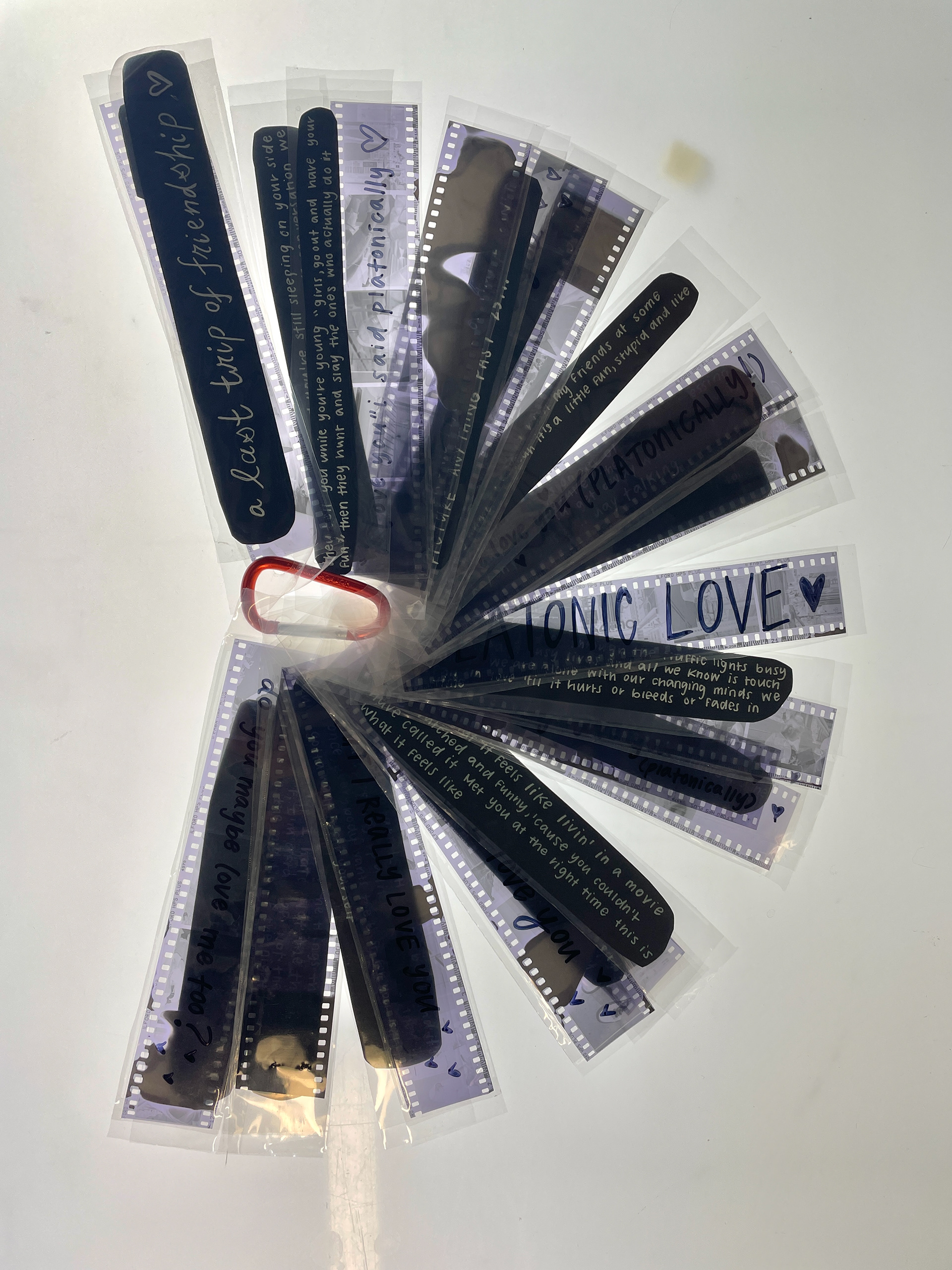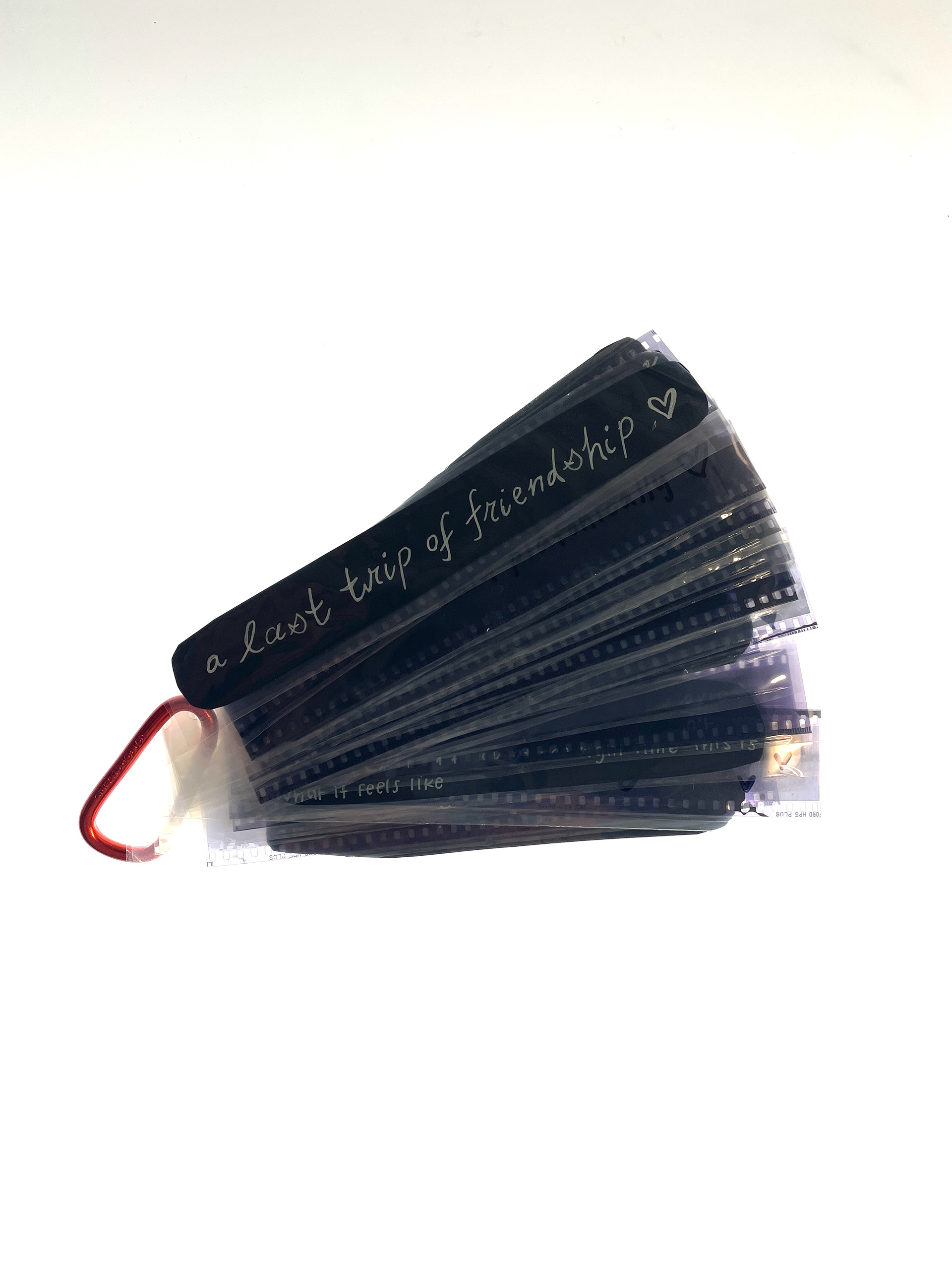 A Last Trip of Friendship is created out of two 35mm rolls of black and white film shot on a point and shoot camera during a three day New York City trip with these two friends. The negative strips are intertwined with strips of black paper holding song lyrics that all deal with the ideas of friendship, growing up and turning twenty-five that we played in the car and train ride there. The lyrics hold my anxiety I have about growing up and holding on to my friends. On every other negative strip there is a different phrasing of saying "I love you" in order to display the intense levels of love that I feel within all my platonic friendships, especially with both of these two friends when we are all together.
